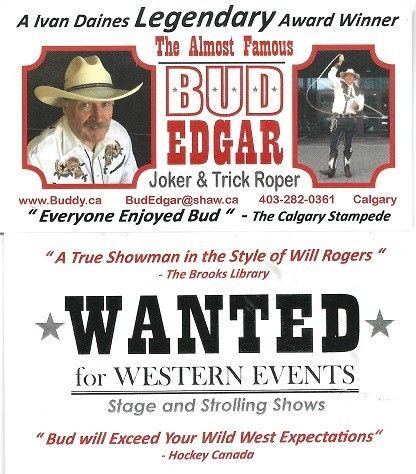 Bud Edgar performs as a Joker and Trick Roper mostly in Calgary and surrounding area. He dresses like a Silver Screen Cowboy ( Roy Rogers ) and performs Stage or Strolling Shows with skills like; The Lost Cowboy Art of Trick Roping, a Funny (Toilet Plunger) Fiddle, Cowboy Poetry, Spur Juggling , Comedy and More ..Bud became "ALMOST FAMOUS" by performing Variety and Western Clown Shows since 1983, He went full time in 1985, see www.buddy.ca for info. By request he started performing without his makeup as a Comedy Cowboy in 2005, see www.ComedyCowboy.com . Bud is a Ivan Daines , Legendary Award winner and the Calgary Stampede said " Everyone enjoyed Bud's Shows "
